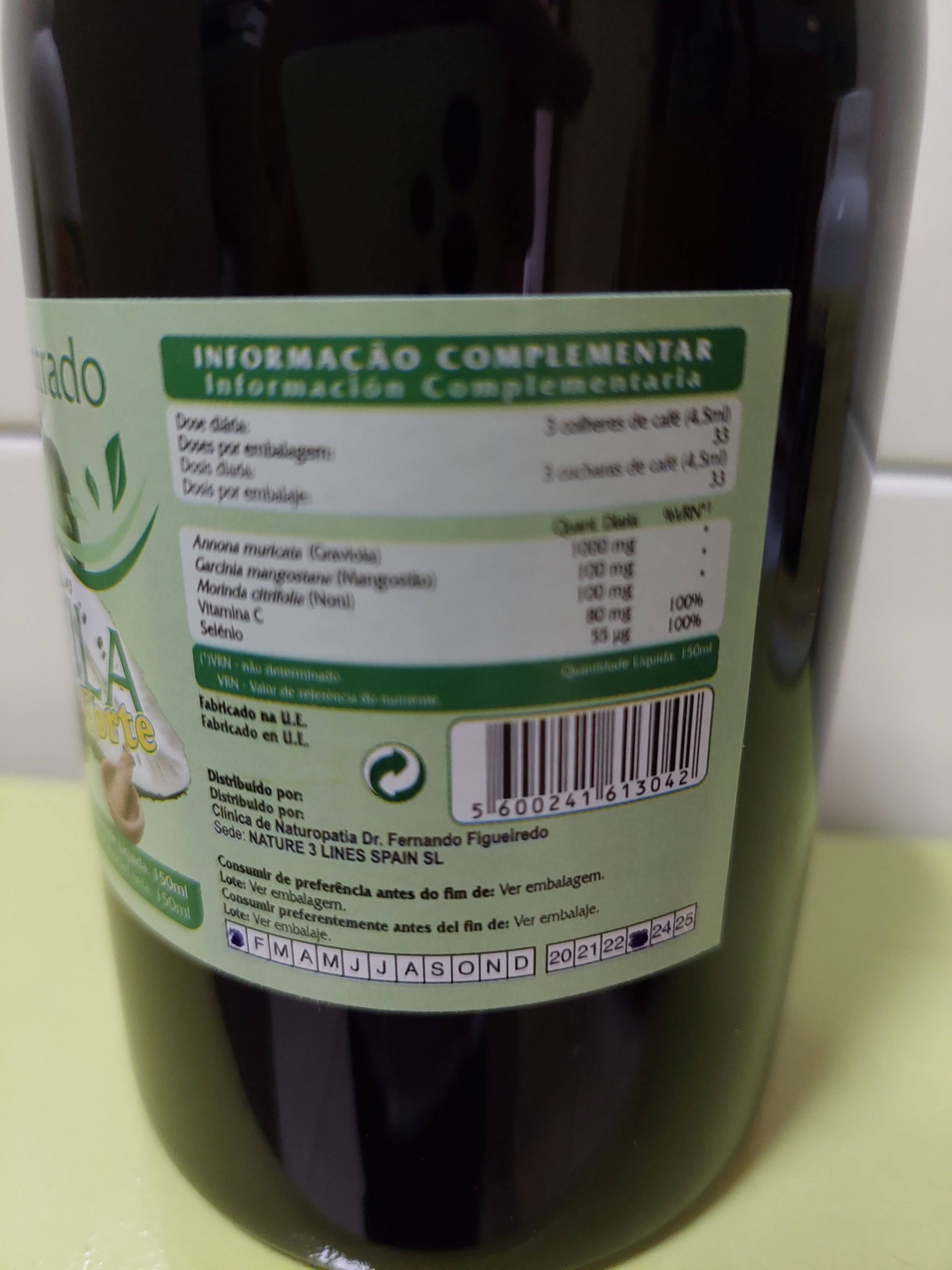 Annona muricata (Gavriola) 1000mg; Garcinia mangostana (mangostão) 100mg; Morinda citrifolia, (Noni) 100mg; Vitamina C 80mg; Selénio 5mg.