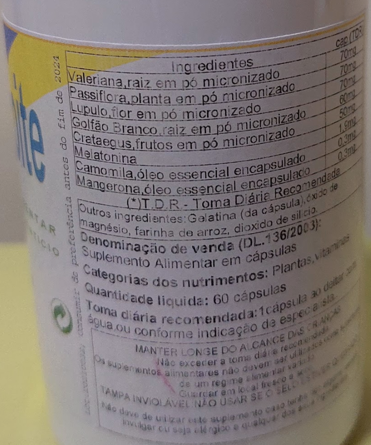 Ingredientes: Valeriana, raiz em pó micronizado; Passiflora, planta em pó micronizado; Lupulo, flor em pó micronizado; Galfão Branco, raiz em pó micronizado; Crataegus, frutos em pó micronizado; Melatonina; Camomila, óleo essencial encapsulado; Mangerona, óleo essencial encapsulado.